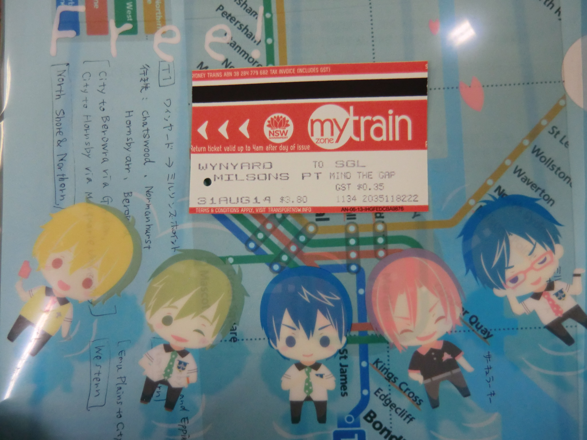 ちなみに作中の曜日が定かではないですが、シドニートレインのサイトで午前9時セントラル駅発オリンピック・パーク駅行きを検索すると以下の結果になりましたので、どちらかに乗ったのかなと妄想。 なお平日休日どちらも9時前にサーキュラーキー駅から発車するインナー・ウェスト&サウス・ラインでリドコム駅まで行っても、オリンピック・パークラインへは同じ時間の電車へ乗り換えられますので、セントラル駅にいたのはやはり絵的な問題ですかね~(;´∀`) ↓参考写真:ミルソンズポイント駅に停車中の電車 作中では向かって右側のシルバーにボーダーラインが入った車体の電車が入線してきましたね。 恐らくこちらが一世代前のタイプで、左側の白いつるっとした車体が最新の車両だと思われます。 シドニーのシティを走る電車は、基本的に二階建てのものがほとんどでした。 私は滞在中一度しか電車に乗る機会がなかったのですが、乗ったのは新しい車両でした。 それよりも気になる点…作中で右側から入線してきた電車に乗ると…目的地とは反対方向に行きます…! 明確にその電車に乗った描写はなかったので大丈夫かと思いますが、すごく気になりました(;-ω-) こちらも参考程度ですが、車内風景と車外からの二階部分の様子です~。 遙と凛は二階建て部分の上階に座っていましたが、私が乗った電車は上階に座っている人が多かったので気が引けて下の方を撮影した写真しかないのが残念なのですが、だいたいの雰囲気はお分かり頂けるかと…。 なお凛が指差していた車窓からの眺めは線路より北側の景色ですが…シドニー大学?昨日行ったホームスティ先の家?何を見ていたのか気になりますね(*´ω`) 切符です。乗っている最中に記念撮影しました(笑) カードサイズで、日本の電車の切符と比べるとかなり大きいです。 ちなみに8月末でこの紙の切符は廃止され、電子切符のみになるような張り紙を見たのですが、今実際どうなっているのでしょうか…? ★13話⇒こちらから
