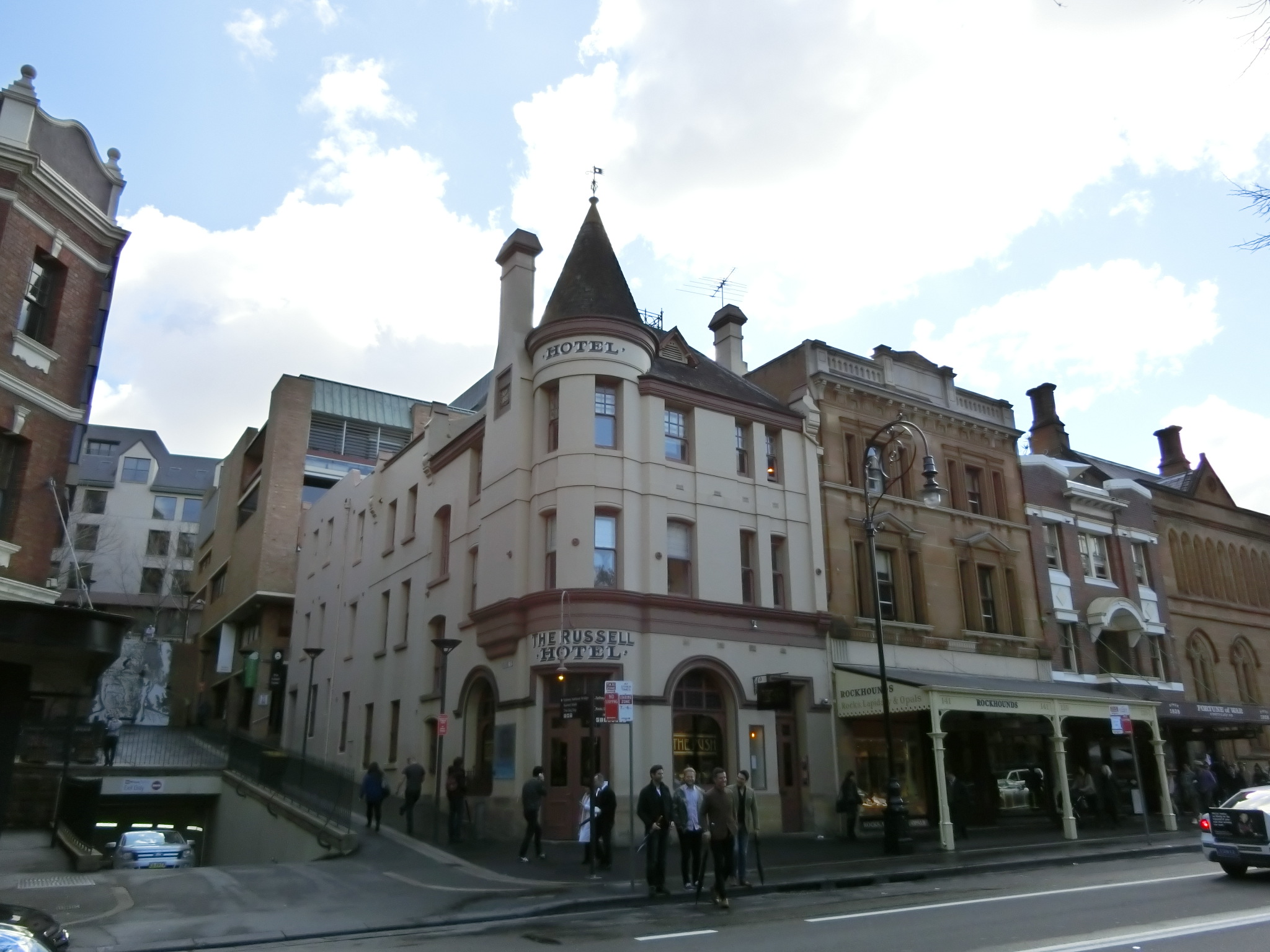 フロントのお姉さんが「今日は満室」と言って部屋交換を断ったわりに背後のルームキーはまだたくさんありましたが、恐らく『Superior Room + Shared Bathroom』が満室な上に、エキストラベッドも用意台数分他へ貸出済みという事だったのでしょう。 またはランクが上の『Deluxe Room With Ensuite』『Superior Deluxe Room With Ensuite』にもツインルームがありますが、部屋に空室があってもアップグレードはホテル側がミスを認めない限り無料ではないので、スーペリアとデラックスの差額80ドル程を即金で払えないとなると難しいですね…日本以外の国は企業側が客に対して下手に出るという事も滅多にないので(;´ー`) という事で、ダブルベッド事件は意外と現実的な事件でした(笑) ■夜のシドニーの街 □カーヒル・エクスプレスウェイから北側の眺め、ジョージストリート&ハーバーブリッジ ストリートビューより引用。 ホテルの夜、ベッドでの会話シーン(こう書くと何やら怪しいですね 視点が上の方からだったので、恐らくこの高架からの景色だと思われます。 ジョージストリートの左側にラッセルホテルがあります。 ビューをアップにして、作中のカメラアングル通りに下の道路から上のブリッジまで見ると、道路脇の標識など細かいところまで全て再現されている事をがわかります。