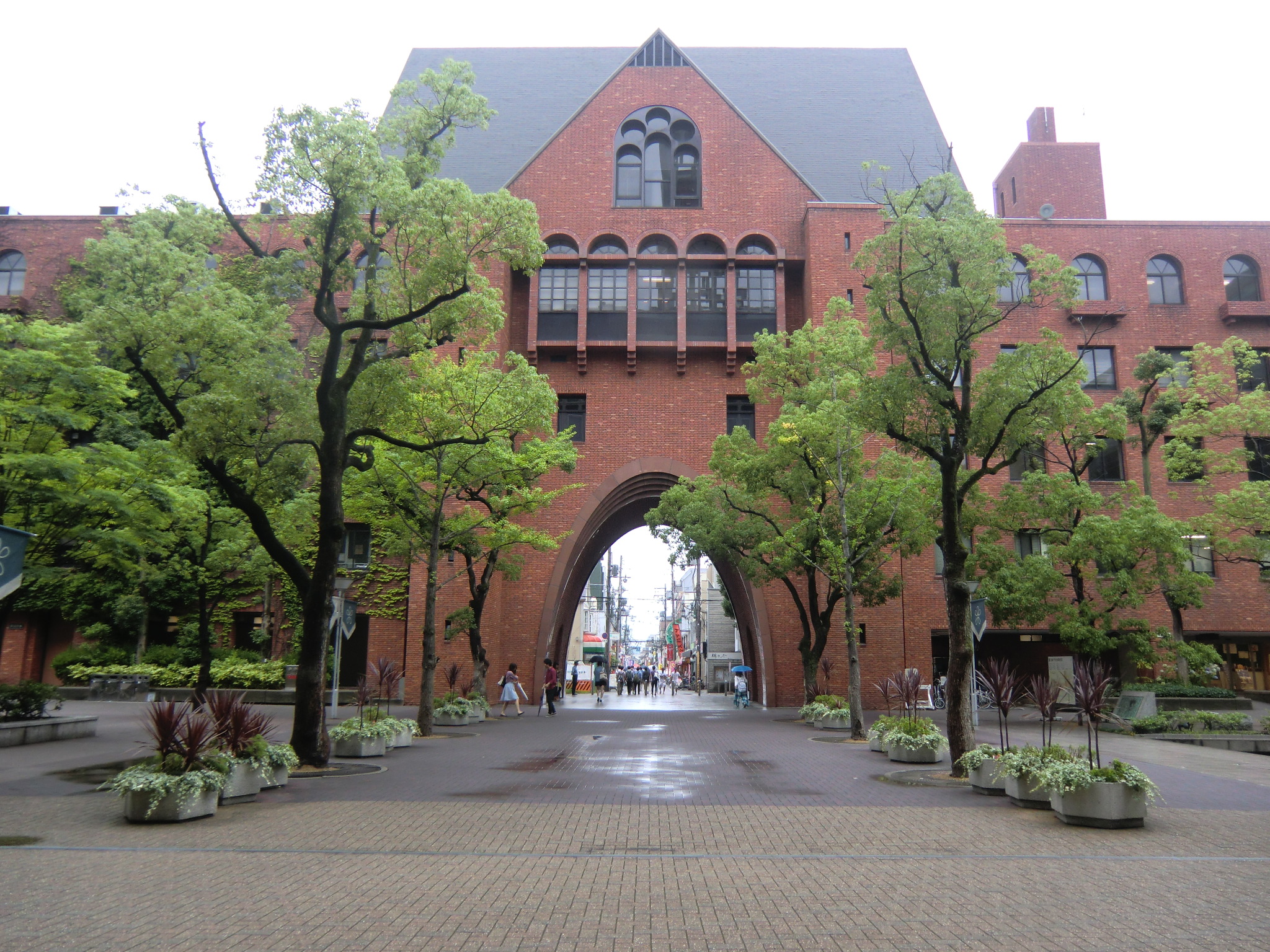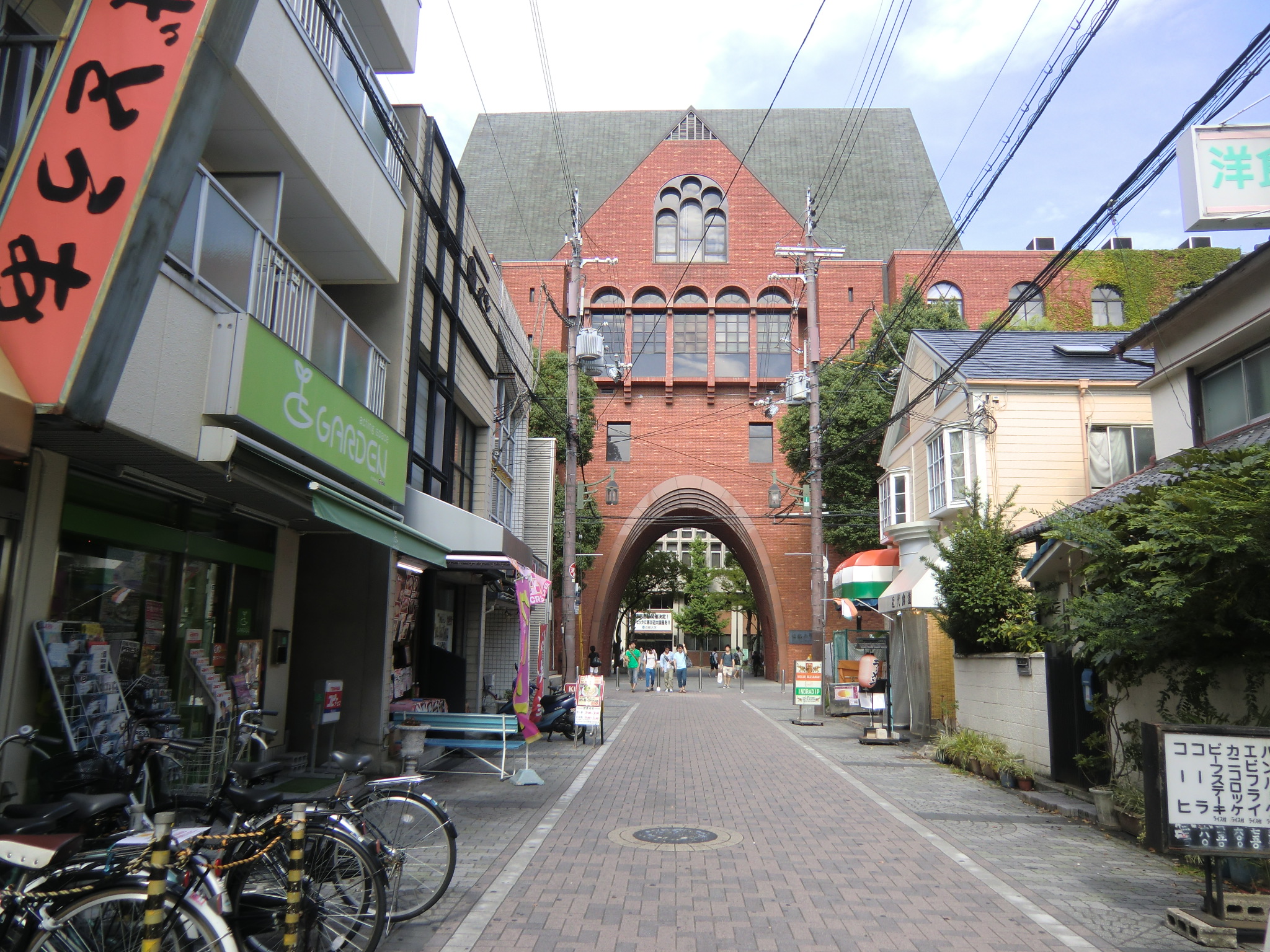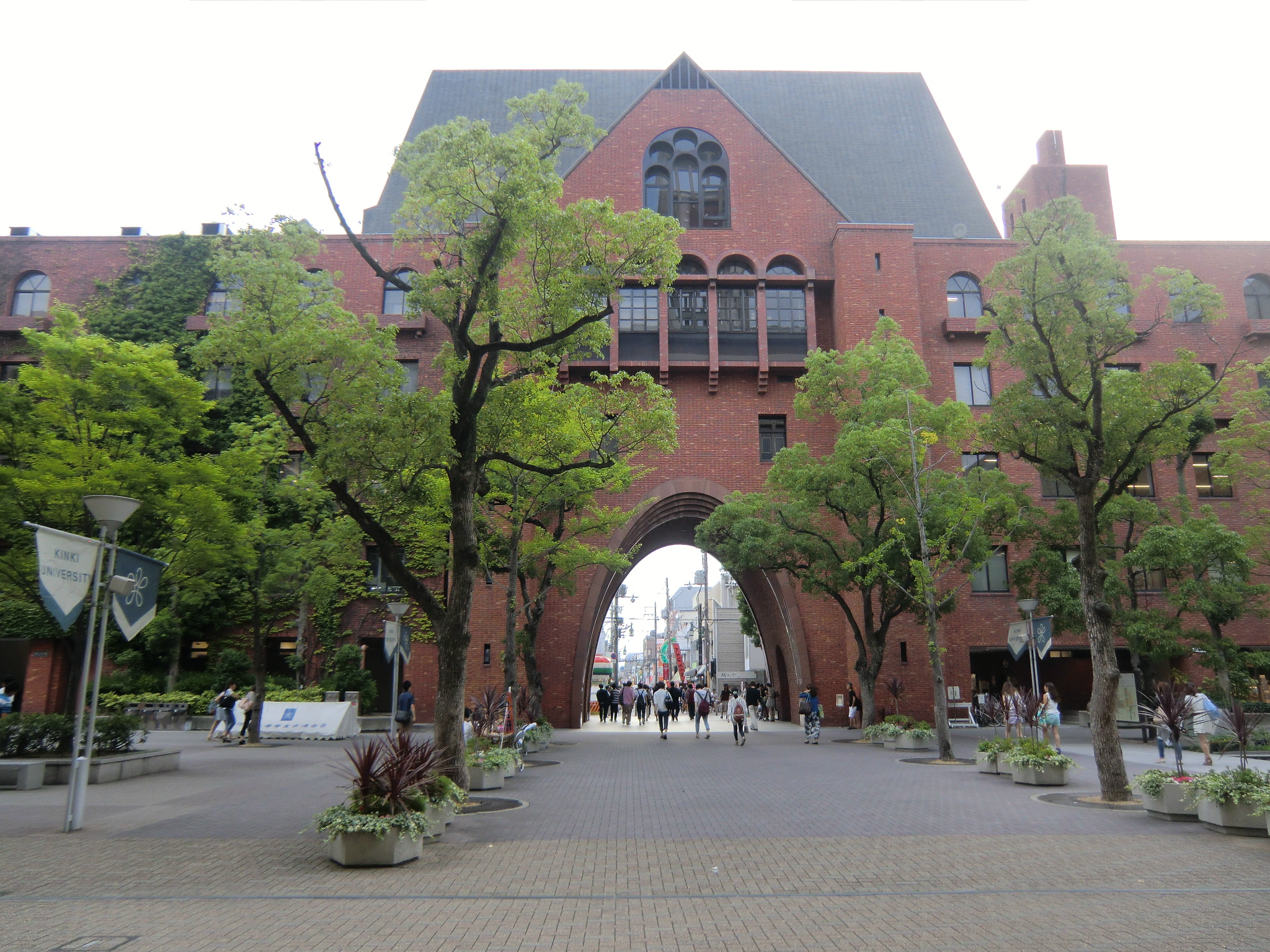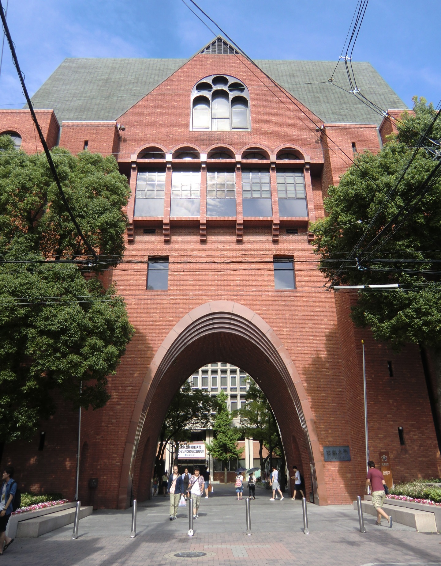 放送日の数日前に、近大サイトのニュースで大学の東大阪キャンパスが凛たちの通う鮫柄学園のモデルになっていると報告があったので、さっそく行ってみました。 1話目なので写った部分の写真は少ないですが、いつものナンセンスな考察を交えて紹介していきます。 またお話が進むにつれて近大との関わりに気づいた点も、随時この記事に追記していきます。 自分が撮影した写真のみ掲載致しますので、ぜひ本編を思い浮かべながら見て頂けると嬉しいです。 (■作中での場面/□実際の名称や場所) 【1Fr】 □近畿大学本部キャンパス 西門 (2014/7/18差し替え) 教会建築のような見た目が特徴的なレンガ造りの門です。 作中では鮫柄学園の尖ったイメージを元にデザインが少しアレンジされていています。 上から順番に ▲高窓 円窓が3つと、その下にはアーチ窓が3つ並んでいますが、作中では丸窓→三角形、アーチ窓→半円部分が三角形に変更されています。 ▲トリフォリウム部分っぽい窓 ここも上部がアーチになっている窓が並んでいますが、作中ではすべて三角窓に変更されています。 ▲トリビューン部分っぽい窓 ここは長方形のまま変更ありません。 ▲アーチ門 アーチがランセット・アーチになって鋭利に尖り、左右に角のようなトンガリが装飾され、鮫柄水泳部のロゴマークの鮫部分に見えるようにうまく改変されています。 ちなみに実際の西門の内部は教員研究室になっているそうです。 □近畿大学 銘板 (2014/7/18差し替え) 作中の「学」の字が新字体なのがちょっと残念です。 近大銘板と同じように旧字体だとより名門校っぽさが出て良いと思うのですが(-ω-) □近畿大学 西門を敷地内から 本来は表側からの門全景のカットですが、実際の西門を表側から撮影すると商店街の店舗で左右が全く撮影できませんので、反対側の敷地内から撮影しました。裏も表もデザインはほとんど同じで、右側に見えている塔の位置のみ逆になっています。 実際の大学前通りは商店街となっていますが、作中ではこの写真のイメージに近い、左右に木の植わった通路に変更されています。 (2014/7/18差し替え) 上記のカットを表側から撮影しようとするとこうなります(笑) ちなみにこちらの商店街には大学生を狙っているのか、ラーメン屋さんが大量に連なって店を構えています。 作中の場面に使用されたカットの紹介は以上です! 教室は、さすがに部外者は侵入できませんので省略します。 ここからは鮫柄学園と近畿大学について。 まず一期の鮫柄学園と二期の鮫柄学園は、学園の建物を建て替えたのか引っ越ししたのかというくらい異なっていますね。 一期は普遍的な学校の校門及び校舎のデザインでしたが、二期になって遙のライバルの凛が通う学校という位置づけよりも、岩鳶高校のライバル校というポジションを全面に出していくためか、急きょ学校の設定も一期よりしっかり練り直したように思われます。 キャラの学年が上がり御子柴部長が引退してしまいましたが、高校卒業後に上の大学に進学していてOBとして高校の水泳部にちょこちょこ顔を出してもおかしくないように、同じ敷地内に中高大がある名門学園の色を濃くしたのかなと推測…。 ガイドブック スタッフインタビュー 美術監督 鵜ノ口穣二氏より 鮫柄学園の設定図その1 ◇西門、本館の間の通路 (2014/7/18追加) 西門の向かい側の本館と奥に見える21号館は、作中では西門と合わせてレンガ造りの建物に変更されています。 ガイドブック スタッフインタビュー 美術監督 鵜ノ口穣二氏より 鮫柄学園の設定図その2 ◇西門を内側から (2014/7/18追加) この設定図は植木の角度や旗までほぼ完ぺきな再現度で感動しました(笑) 近畿大学を鮫柄学園のモデルに選んだ理由は、西日本の大学で水泳をはじめ各スポーツで有名選手を多く輩出していることが関係しているかと思われます。 広大な大学敷地内には各種目の立派なクラブ施設や設備が整っており、スポーツへ力を入れているさまを実感しました。また2020年東京オリンピック開催決定を受けて、今までスポーツの各分野で活躍した卒業生たちの一覧を年表にして各所に掲示してありました。 水泳で活躍した選手をピックアップ 2000年シドニーオリンピック 200m背泳ぎ 銅メダル 2004年アテネオリンピック 200mバタフライ 銀メダル 400mメドレーリレー 銅メダル 中西悠子元競泳選手(2004年卒) 2003年世界水泳、2004年アテネオリンピック、2005年世界水泳 200mバタフライ 銅メダル 奥村幸大競泳選手(2006年卒) 2004年アテネオリンピック 400mメドレーリレー 銅メダル 山口美咲競泳選手(2012年卒) 2008年北京オリンピック フリーリレー入賞等 メドレーリレーのメダル獲得時の写真を見ると、Free!と重ねてしまってぐっとくるものがあります(つД`)2004年のアテネオリンピックでのメドレーリレーでメダル獲得は44年ぶりだったそうで…。 2012年ロンドンオリンピック 100m背泳ぎ 銅メダル 200m背泳ぎ 銀メダル 400mメドレーリレー 銀メダル 寺川綾元