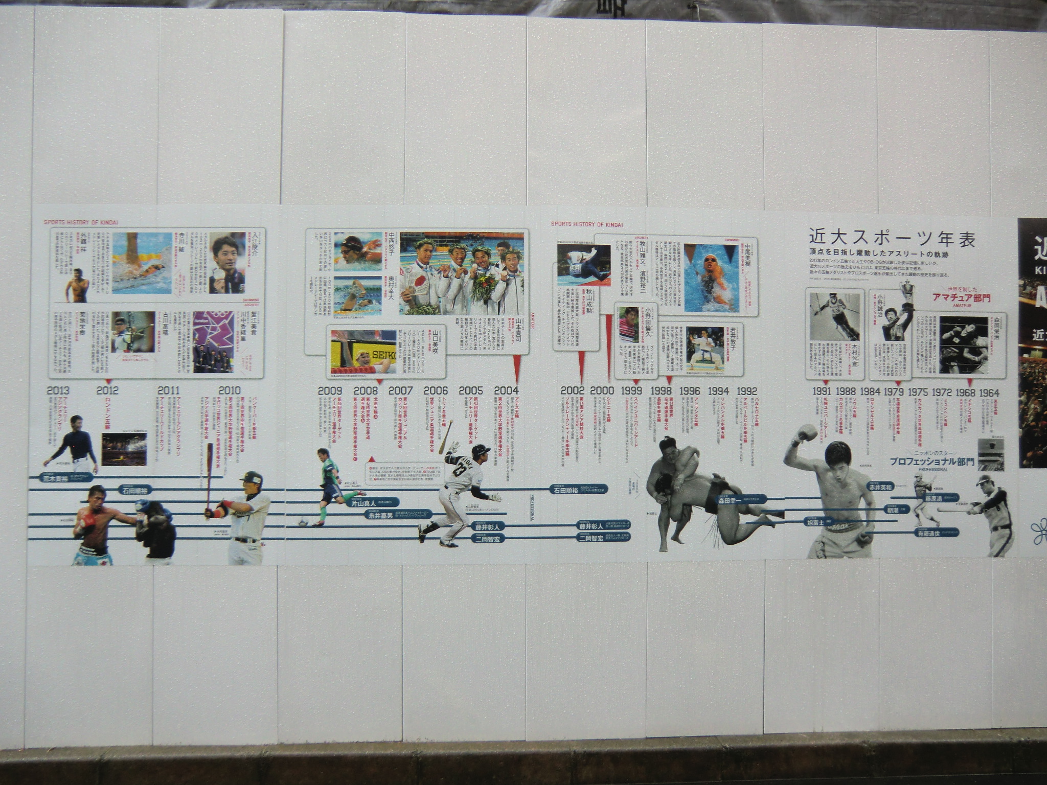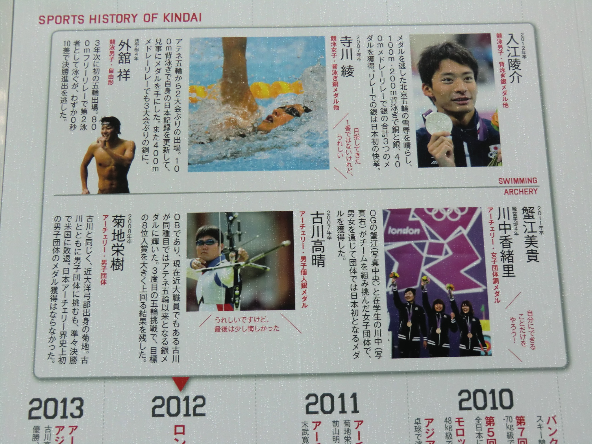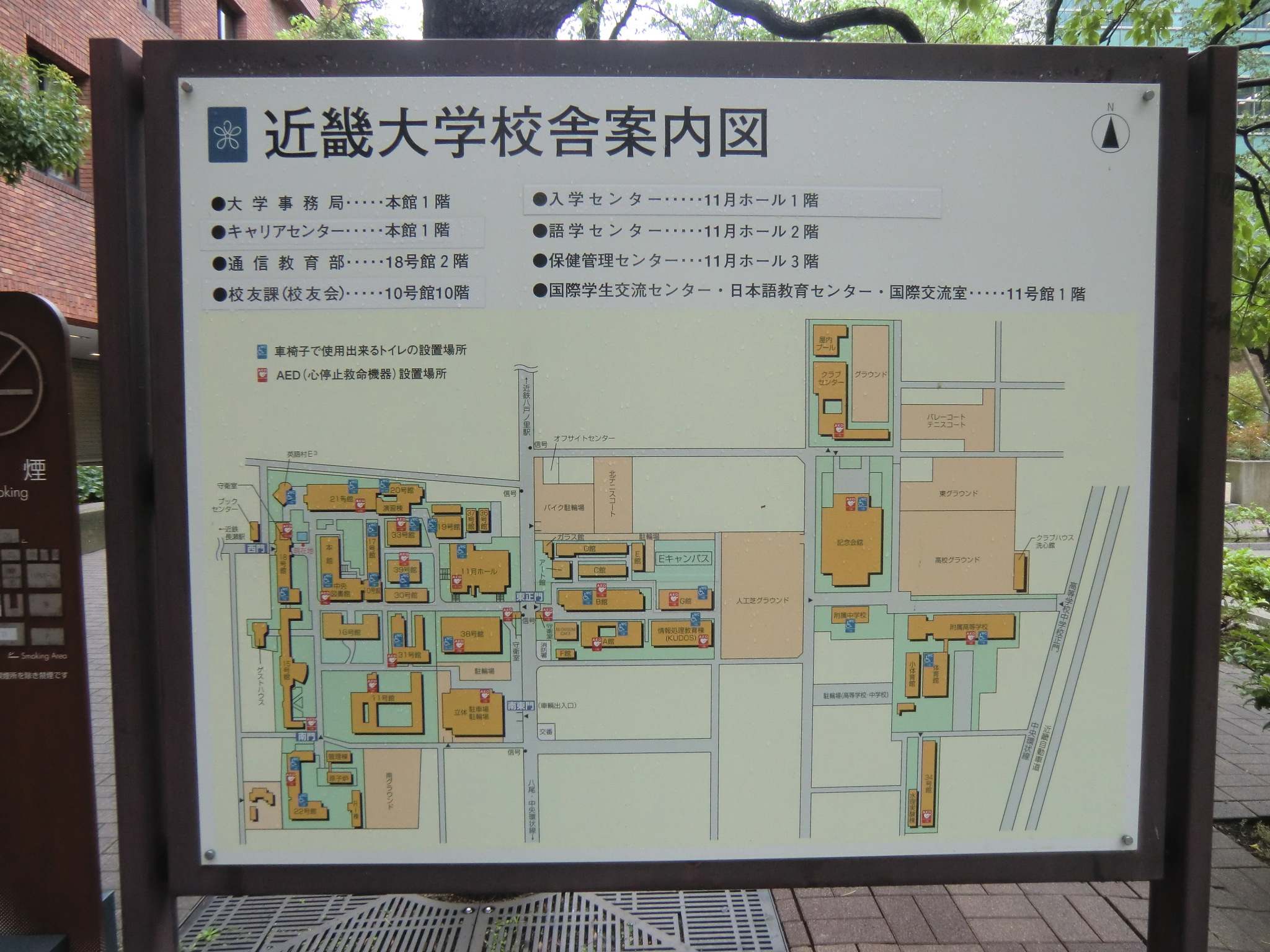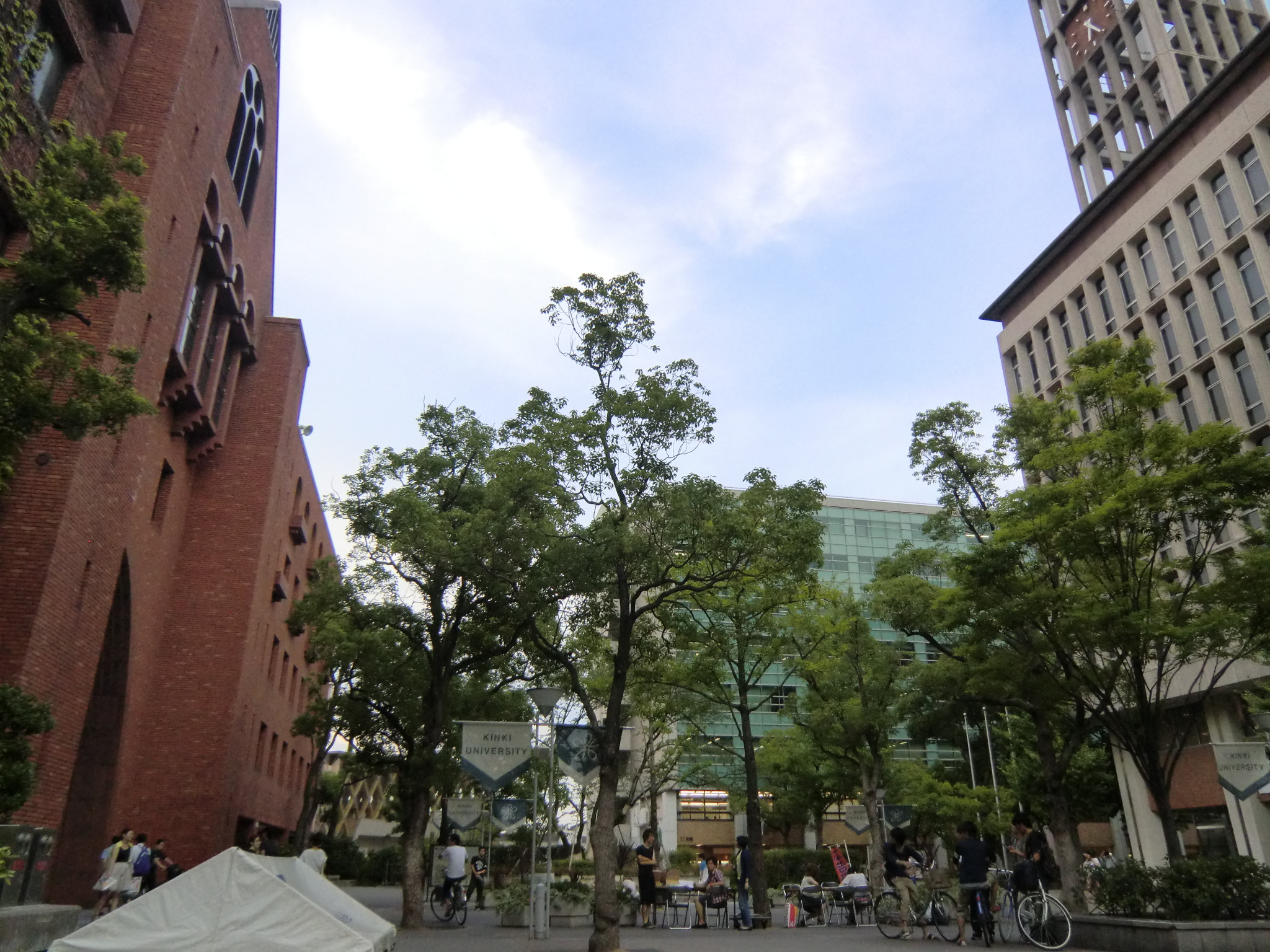 放送日の数日前に、近大サイトのニュースで大学の東大阪キャンパスが凛たちの通う鮫柄学園のモデルになっていると報告があったので、さっそく行ってみました。 1話目なので写った部分の写真は少ないですが、いつものナンセンスな考察を交えて紹介していきます。 またお話が進むにつれて近大との関わりに気づいた点も、随時この記事に追記していきます。 自分が撮影した写真のみ掲載致しますので、ぜひ本編を思い浮かべながら見て頂けると嬉しいです。 (■作中での場面/□実際の名称や場所) 【1Fr】 □近畿大学本部キャンパス 西門 (2014/7/18差し替え) 教会建築のような見た目が特徴的なレンガ造りの門です。 作中では鮫柄学園の尖ったイメージを元にデザインが少しアレンジされていています。 上から順番に ▲高窓 円窓が3つと、その下にはアーチ窓が3つ並んでいますが、作中では丸窓→三角形、アーチ窓→半円部分が三角形に変更されています。 ▲トリフォリウム部分っぽい窓 ここも上部がアーチになっている窓が並んでいますが、作中ではすべて三角窓に変更されています。 ▲トリビューン部分っぽい窓 ここは長方形のまま変更ありません。 ▲アーチ門 アーチがランセット・アーチになって鋭利に尖り、左右に角のようなトンガリが装飾され、鮫柄水泳部のロゴマークの鮫部分に見えるようにうまく改変されています。 ちなみに実際の西門の内部は教員研究室になっているそうです。 □近畿大学 銘板 (2014/7/18差し替え) 作中の「学」の字が新字体なのがちょっと残念です。 近大銘板と同じように旧字体だとより名門校っぽさが出て良いと思うのですが(-ω-) □近畿大学 西門を敷地内から 本来は表側からの門全景のカットですが、実際の西門を表側から撮影すると商店街の店舗で左右が全く撮影できませんので、反対側の敷地内から撮影しました。裏も表もデザインはほとんど同じで、右側に見えている塔の位置のみ逆になっています。 実際の大学前通りは商店街となっていますが、作中ではこの写真のイメージに近い、左右に木の植わった通路に変更されています。 (2014/7/18差し替え) 上記のカットを表側から撮影しようとするとこうなります(笑) ちなみにこちらの商店街には大学生を狙っているのか、ラーメン屋さんが大量に連なって店を構えています。 作中の場面に使用されたカットの紹介は以上です! 教室は、さすがに部外者は侵入できませんので省略します。 ここからは鮫柄学園と近畿大学について。 まず一期の鮫柄学園と二期の鮫柄学園は、学園の建物を建て替えたのか引っ越ししたのかというくらい異なっていますね。 一期は普遍的な学校の校門及び校舎のデザインでしたが、二期になって遙のライバルの凛が通う学校という位置づけよりも、岩鳶高校のライバル校というポジションを全面に出していくためか、急きょ学校の設定も一期よりしっかり練り直したように思われます。 キャラの学年が上がり御子柴部長が引退してしまいましたが、高校卒業後に上の大学に進学していてOBとして高校の水泳部にちょこちょこ顔を出してもおかしくないように、同じ敷地内に中高大がある名門学園の色を濃くしたのかなと推測…。 ガイドブック スタッフインタビュー 美術監督 鵜ノ口穣二氏より 鮫柄学園の設定図その1 ◇西門、本館の間の通路 (2014/7/18追加) 西門の向かい側の本館と奥に見える21号館は、作中では西門と合わせてレンガ造りの建物に変更されています。 ガイドブック スタッフインタビュー 美術監督 鵜ノ口穣二氏より 鮫柄学園の設定図その2 ◇西門を内側から (2014/7/18追加) この設定図は植木の角度や旗までほぼ完ぺきな再現度で感動しました(笑) 近畿大学を鮫柄学園のモデルに選んだ理由は、西日本の大学で水泳をはじめ各スポーツで有名選手を多く輩出していることが関係しているかと思われます。 広大な大学敷地内には各種目の立派なクラブ施設や設備が整っており、スポーツへ力を入れているさまを実感しました。また2020年東京オリンピック開催決定を受けて、今までスポーツの各分野で活躍した卒業生たちの一覧を年表にして各所に掲示してありました。 水泳で活躍した選手をピックアップ 2000年シドニーオリンピック 200m背泳ぎ 銅メダル 2004年アテネオリンピック 200mバタフライ 銀メダル 400mメドレーリレー 銅メダル 中西悠子元競泳選手(2004年卒) 2003年世界水泳、2004年アテネオリンピック、2005年世界水泳 200mバタフライ 銅メダル 奥村幸大競泳選手(2006年卒) 2004年アテネオリンピック 400mメドレーリレー 銅メダル 山口美咲競泳選手(2012年卒) 2008年北京オリンピック フリーリレー入賞等 メドレーリレーのメダル獲得時の写真を見ると、Free!と重ねてしまってぐっとくるものがあります(つД`)2004年のアテネオリンピックでのメドレーリレーでメダル獲得は44年ぶりだったそうで…。 2012年ロンドンオリンピック 100m背泳ぎ 銅メダル 200m背泳ぎ 銀メダル 400mメドレーリレー 銀メダル 寺川綾元