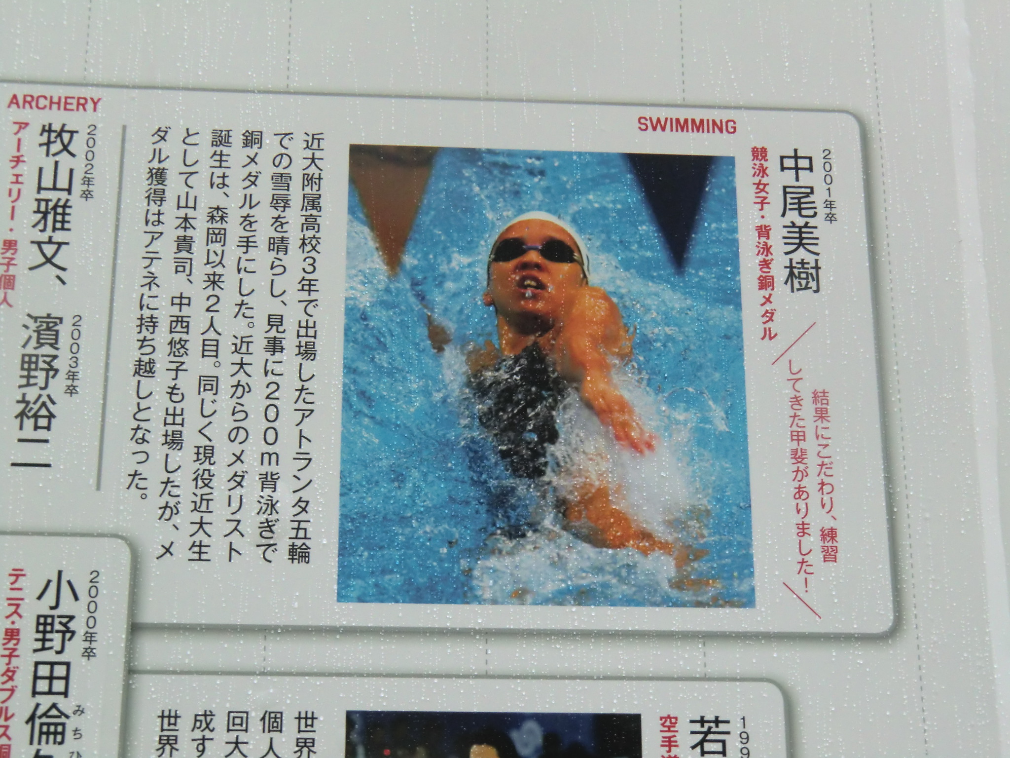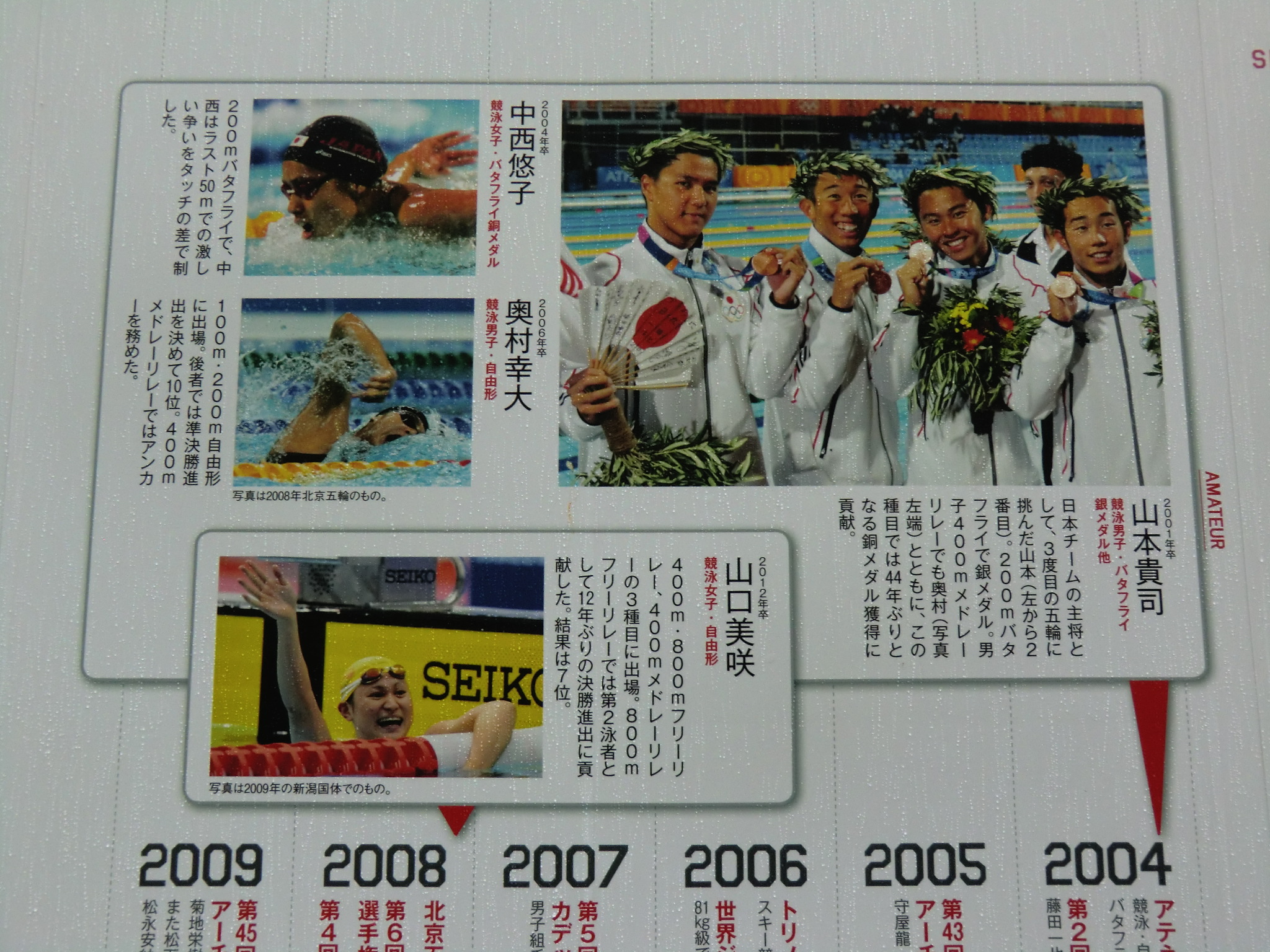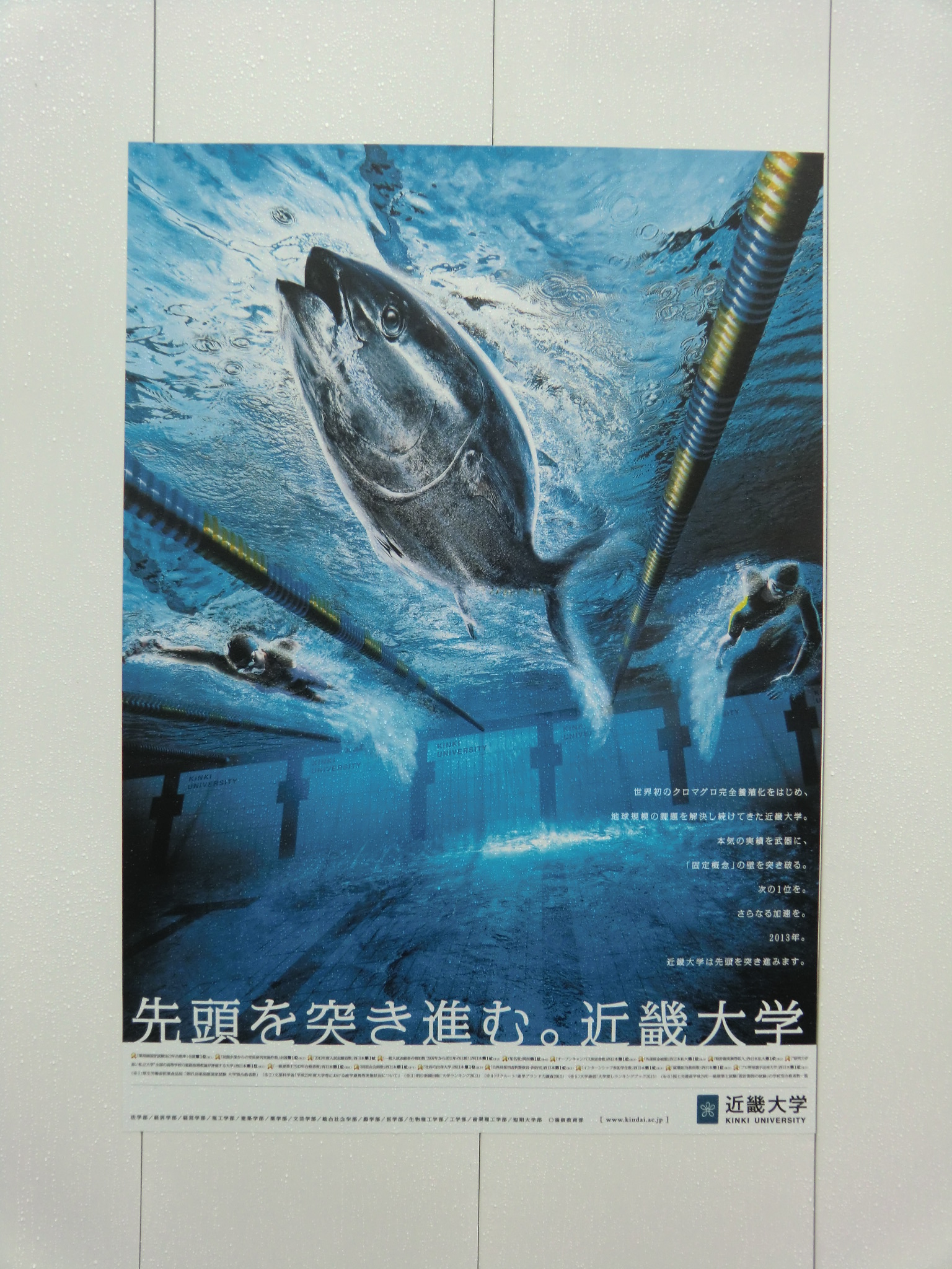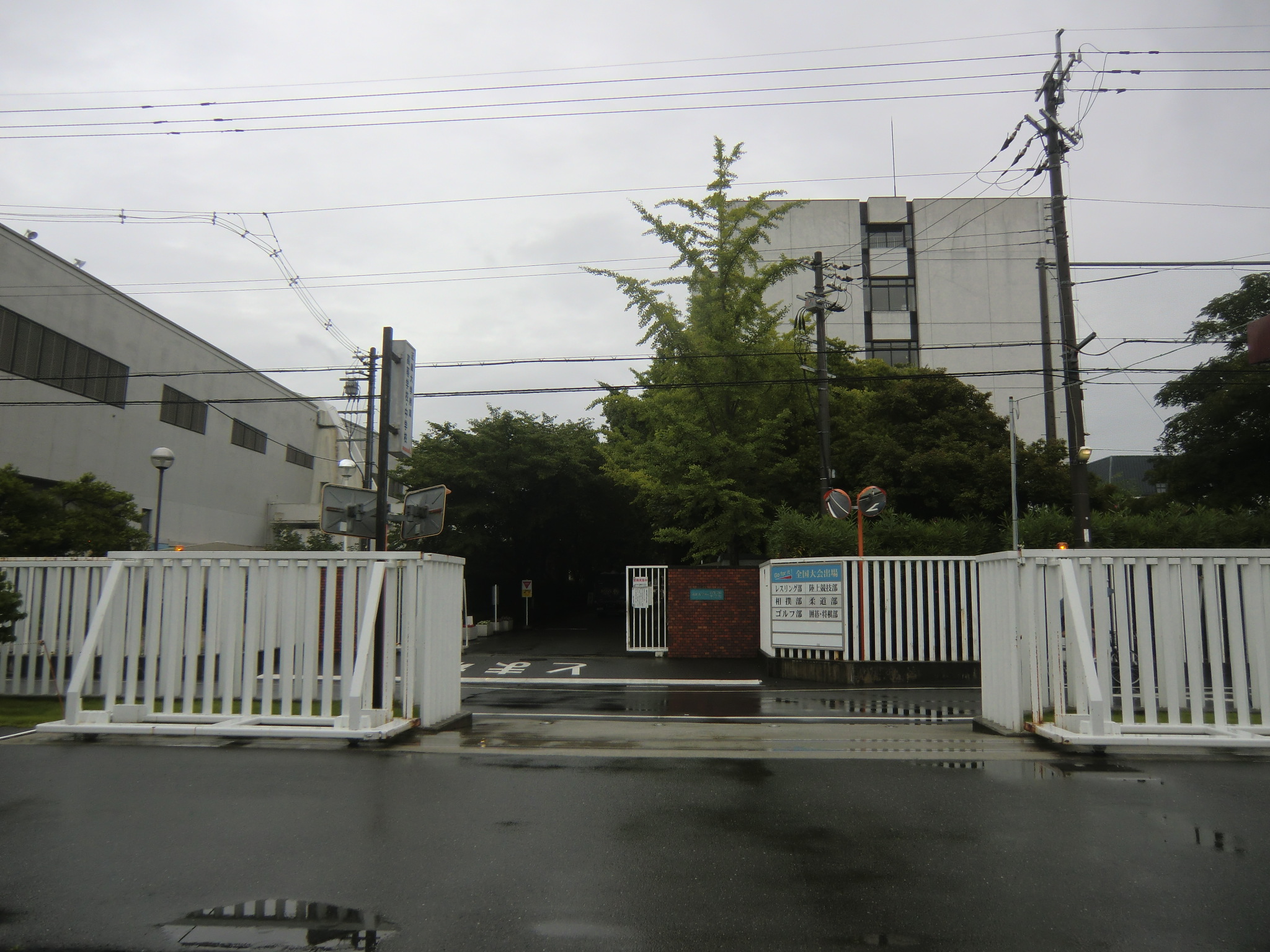 放送日の数日前に、近大サイトのニュースで大学の東大阪キャンパスが凛たちの通う鮫柄学園のモデルになっていると報告があったので、さっそく行ってみました。 1話目なので写った部分の写真は少ないですが、いつものナンセンスな考察を交えて紹介していきます。 またお話が進むにつれて近大との関わりに気づいた点も、随時この記事に追記していきます。 自分が撮影した写真のみ掲載致しますので、ぜひ本編を思い浮かべながら見て頂けると嬉しいです。 (■作中での場面/□実際の名称や場所) 【1Fr】 □近畿大学本部キャンパス 西門 (2014/7/18差し替え) 教会建築のような見た目が特徴的なレンガ造りの門です。 作中では鮫柄学園の尖ったイメージを元にデザインが少しアレンジされていています。 上から順番に ▲高窓 円窓が3つと、その下にはアーチ窓が3つ並んでいますが、作中では丸窓→三角形、アーチ窓→半円部分が三角形に変更されています。 ▲トリフォリウム部分っぽい窓 ここも上部がアーチになっている窓が並んでいますが、作中ではすべて三角窓に変更されています。 ▲トリビューン部分っぽい窓 ここは長方形のまま変更ありません。 ▲アーチ門 アーチがランセット・アーチになって鋭利に尖り、左右に角のようなトンガリが装飾され、鮫柄水泳部のロゴマークの鮫部分に見えるようにうまく改変されています。 ちなみに実際の西門の内部は教員研究室になっているそうです。 □近畿大学 銘板 (2014/7/18差し替え) 作中の「学」の字が新字体なのがちょっと残念です。 近大銘板と同じように旧字体だとより名門校っぽさが出て良いと思うのですが(-ω-) □近畿大学 西門を敷地内から 本来は表側からの門全景のカットですが、実際の西門を表側から撮影すると商店街の店舗で左右が全く撮影できませんので、反対側の敷地内から撮影しました。裏も表もデザインはほとんど同じで、右側に見えている塔の位置のみ逆になっています。 実際の大学前通りは商店街となっていますが、作中ではこの写真のイメージに近い、左右に木の植わった通路に変更されています。 (2014/7/18差し替え) 上記のカットを表側から撮影しようとするとこうなります(笑) ちなみにこちらの商店街には大学生を狙っているのか、ラーメン屋さんが大量に連なって店を構えています。 作中の場面に使用されたカットの紹介は以上です! 教室は、さすがに部外者は侵入できませんので省略します。 ここからは鮫柄学園と近畿大学について。 まず一期の鮫柄学園と二期の鮫柄学園は、学園の建物を建て替えたのか引っ越ししたのかというくらい異なっていますね。 一期は普遍的な学校の校門及び校舎のデザインでしたが、二期になって遙のライバルの凛が通う学校という位置づけよりも、岩鳶高校のライバル校というポジションを全面に出していくためか、急きょ学校の設定も一期よりしっかり練り直したように思われます。 キャラの学年が上がり御子柴部長が引退してしまいましたが、高校卒業後に上の大学に進学していてOBとして高校の水泳部にちょこちょこ顔を出してもおかしくないように、同じ敷地内に中高大がある名門学園の色を濃くしたのかなと推測…。 ガイドブック スタッフインタビュー 美術監督 鵜ノ口穣二氏より 鮫柄学園の設定図その1 ◇西門、本館の間の通路 (2014/7/18追加) 西門の向かい側の本館と奥に見える21号館は、作中では西門と合わせてレンガ造りの建物に変更されています。 ガイドブック スタッフインタビュー 美術監督 鵜ノ口穣二氏より 鮫柄学園の設定図その2 ◇西門を内側から (2014/7/18追加) この設定図は植木の角度や旗までほぼ完ぺきな再現度で感動しました(笑) 近畿大学を鮫柄学園のモデルに選んだ理由は、西日本の大学で水泳をはじめ各スポーツで有名選手を多く輩出していることが関係しているかと思われます。 広大な大学敷地内には各種目の立派なクラブ施設や設備が整っており、スポーツへ力を入れているさまを実感しました。また2020年東京オリンピック開催決定を受けて、今までスポーツの各分野で活躍した卒業生たちの一覧を年表にして各所に掲示してありました。 水泳で活躍した選手をピックアップ 2000年シドニーオリンピック 200m背泳ぎ 銅メダル 2004年アテネオリンピック 200mバタフライ 銀メダル 400mメドレーリレー 銅メダル 中西悠子元競泳選手(2004年卒) 2003年世界水泳、2004年アテネオリンピック、2005年世界水泳 200mバタフライ 銅メダル 奥村幸大競泳選手(2006年卒) 2004年アテネオリンピック 400mメドレーリレー 銅メダル 山口美咲競泳選手(2012年卒) 2008年北京オリンピック フリーリレー入賞等 メドレーリレーのメダル獲得時の写真を見ると、Free!と重ねてしまってぐっとくるものがあります(つД`)2004年のアテネオリンピックでのメドレーリレーでメダル獲得は44年ぶりだったそうで…。 2012年ロンドンオリンピック 100m背泳ぎ 銅メダル 200m背泳ぎ 銀メダル 400mメドレーリレー 銀メダル 寺川綾元