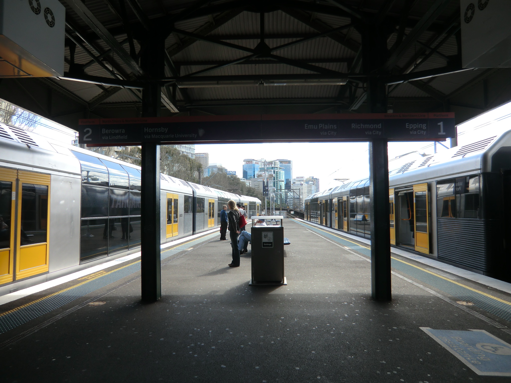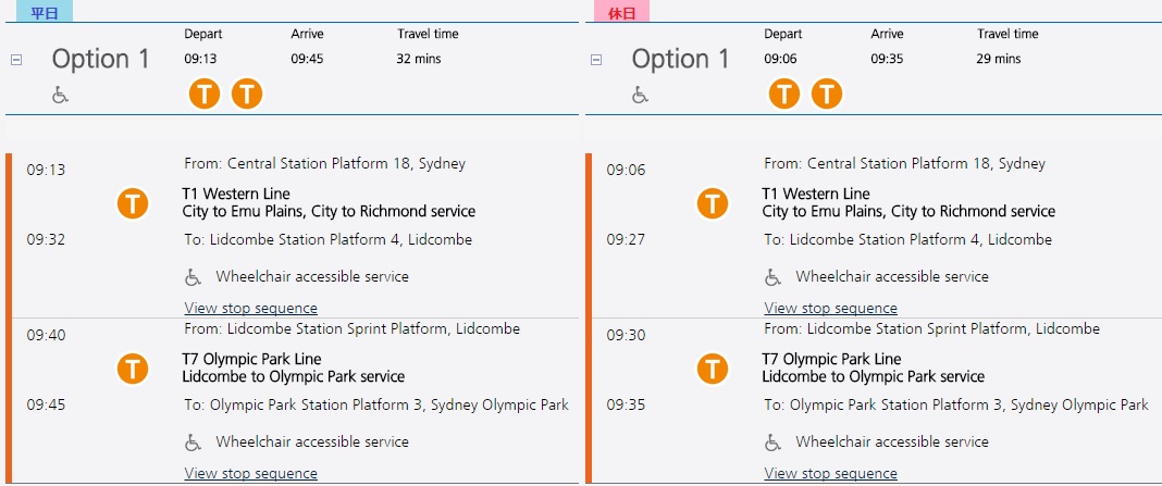 一応サーキュラーキー駅から電車に乗ってオリンピック・パークまで行く場合、さらに途中で乗り換えるリドコム駅までセントラル駅で降りて乗り換えずとも行ける路線のインナー・ウェスト・ラインとサウス・ラインが走っているのですが、時間と経由、あと絵的な分かりやすさ(笑)の都合でセントラル駅で乗り換えたのかなと推測。ストリートビューより引用。 一番東側にあたるホーム(遙と凛がいるのは東側から2つ目のホーム)ですが、右側が少し高くなっているレンガの塀、左側の看板、奥の白いビルなどの風景が作中と一致していますね。 (↓以下経路の推測) セントラル駅からオリンピック・パーク駅までの行き方としては主に3通りあり、 ①セントラル駅(オリンピック・パーク・ライン直通)→オリンピック・パーク駅 ②セントラル駅(インナー・ウェスト・ライン/ウェスタン・ライン/サウス・ライン)→リドコム駅(オリンピック・パーク・ライン)→オリンピック・パーク駅 ③セントラル駅(ノーザン・ライン)→ストラスフィールド駅(インナー・ウェスト・ライン/ウェスタン・ライン/サウス・ライン)→リドコム駅(オリンピック・パーク・ライン)→オリンピック・パーク駅 あたりが考えられますが、①の直通路線は一日の本数が少なく、かつセントラル駅の発着が近郊路線用のホームではなく都市間路線用の頭端式ホームになり、作中で描かれていたホームが近郊路線用だったため、これは利用していないと思われます。 また③のノーザン・ライン利用も乗換が1駅多くややこしいので、②の3つのうちどれかの路線でリドコム駅まで行くルートで行ったと考えられます。 この場合乗り場は18番か19番(東側から3つ目にあたるホーム)が多いのですが(シドニーの電車はよく週末の路線工事等で乗り場が変わったりするそうです)、作中では東側から2つ目のホームに見えますね…。 なお、セントラル駅からリドコム駅までは約20分、リドコム駅からオリンピック・パーク駅までは約5分で、乗換の時間を入れて計約35分ほどで着きます。